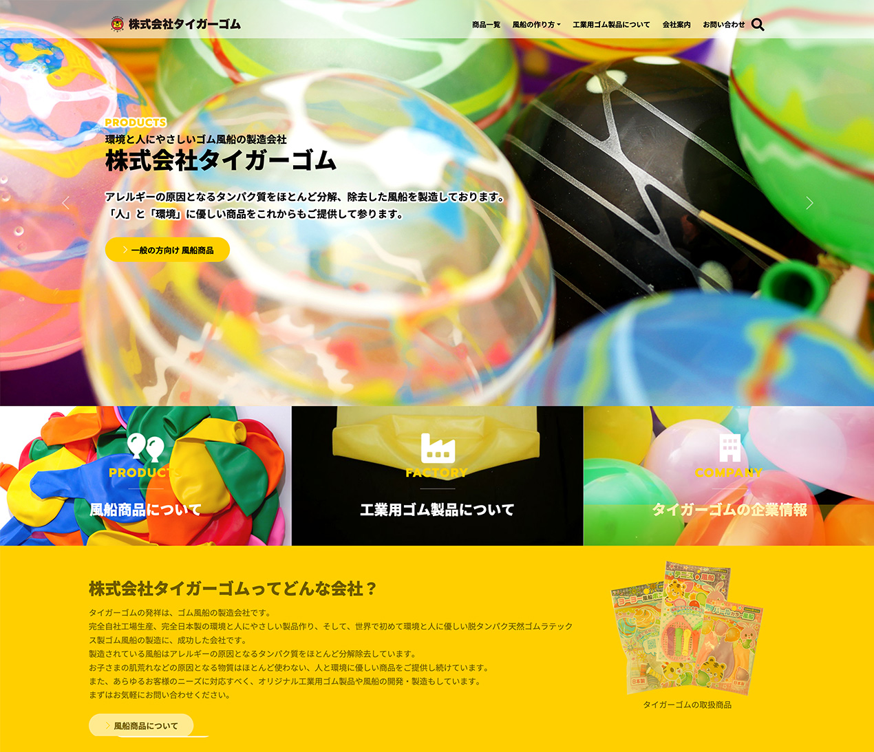 「株式会社タイガーゴム」は東大阪にある、前身を含め110年以上の歴史を誇る各種ゴムの製造会社。完全自社工場生産で安心かつ、環境と人にやさしい製品を行う企業。 主にゴム風船・バルーン全般などを中心に製品を製造しており、その商品をよりわかりやすくお子さまやご家族さまに使っていただけるよう「わかりやすく見やすい」イメージ作りを念頭にWebサイトで表現。 結果、商品一覧・詳細と風船の作り方のマニュアルビデオ、企業特性などをシンプルに紹介。企業のブランド価値の向上に貢献している。